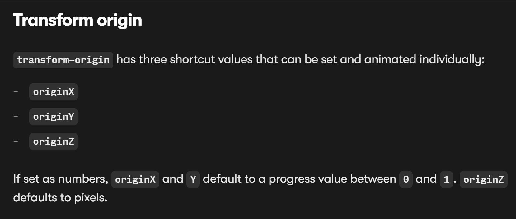 공식 홈페이지를 찾아보니 framer motion에서 transform origin을 적용하려면 originX, originY, originZ를 사용해야 되는 것 같다.